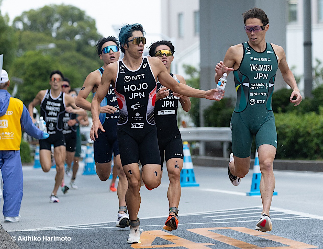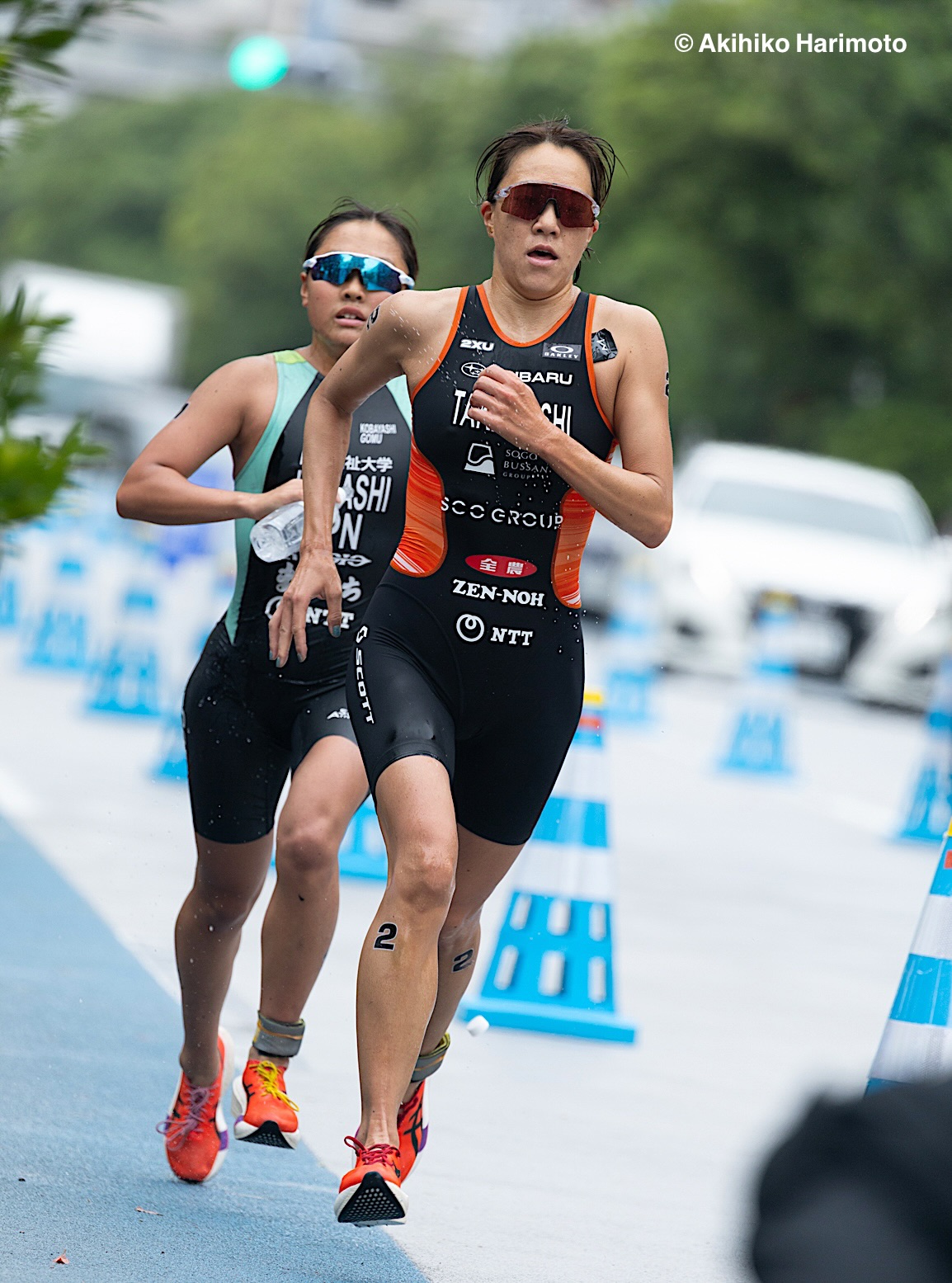 ランに入って高橋選手と2人だけの勝負となり、最初の5kmまでは(彼女に)引っ張ってもらうかたちになったのですが、残り2周になって(全2.5km × 4周)少しペースを上げて前に出ようとしたんです。